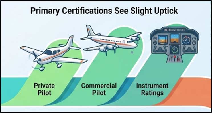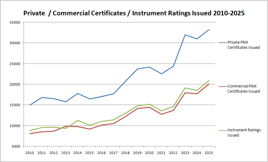 Looking at specific certificates and ratings, we see that the primary certificates of private pilot and commercial pilot, and the instrument rating, did see increases in certification in 2025 again. The increases were minimal, but again, keep the number of certifications growing to fill our next generations of commercial pilots.