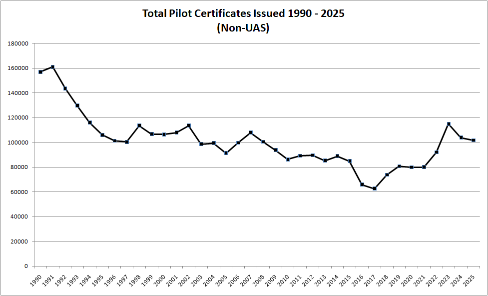 Here is what we see when it comes to total pilot certificates issued over the past 35 years.