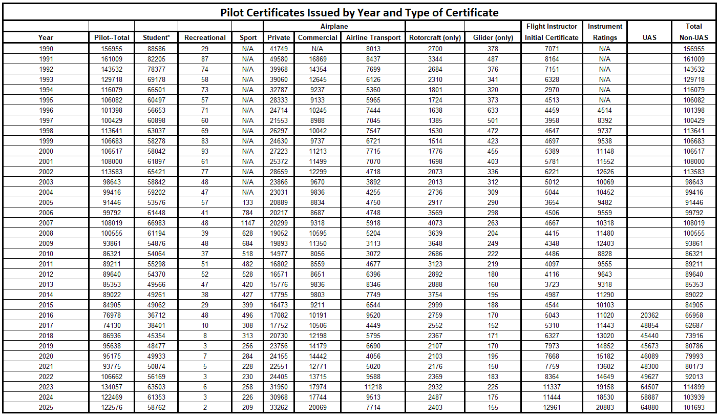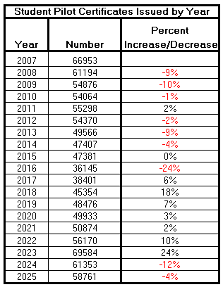 If airline hiring increases over the next two years, we may see this interest increase again in the upcoming years. It will certainly be something to watch and see how these numbers play out as hiring increases or decreases affect the intake of new student pilot certificate issuance.
