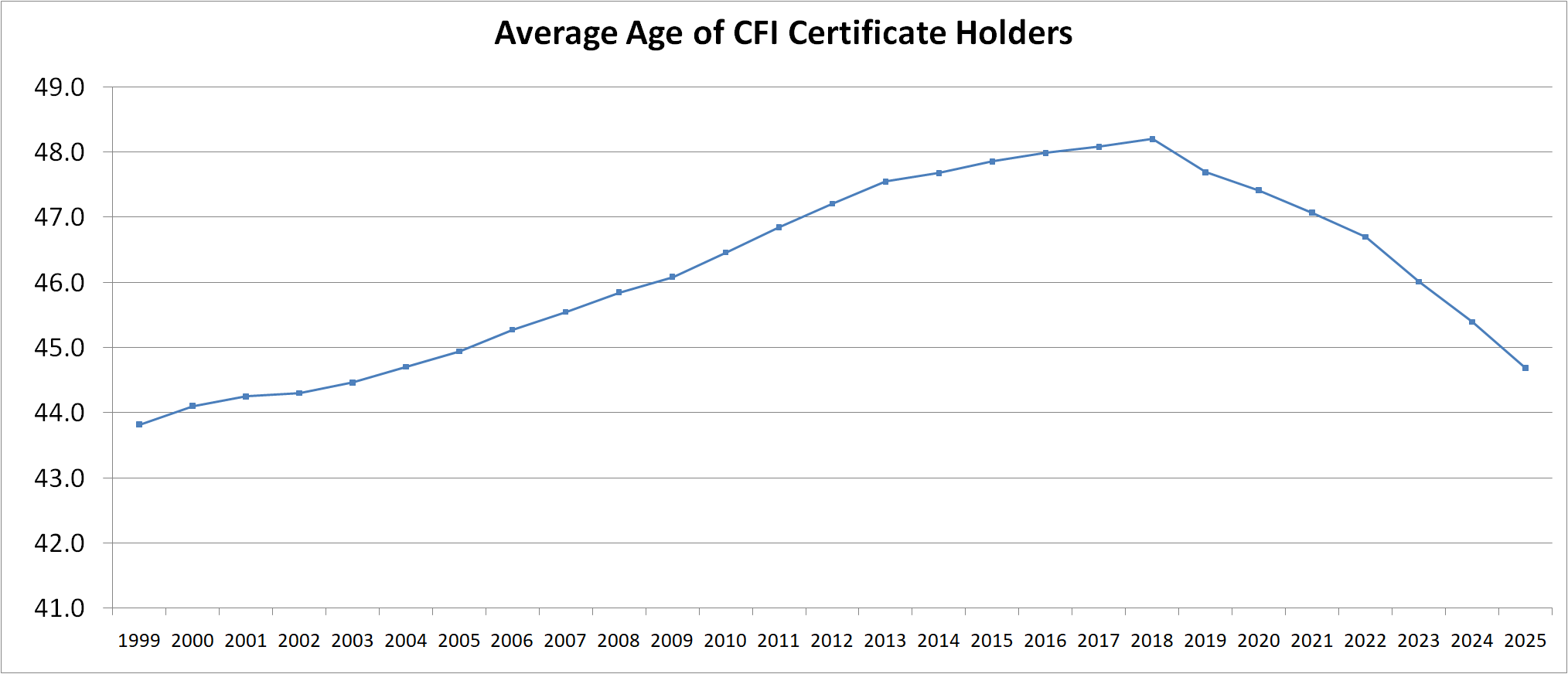 Then we might look at the average age of CFI certificate holders in the entire population, which we see as having been slightly under 44 back in 1999. By 2018, we saw a high point of that average age peaking at over 48 years old. But since then, the average has been decreasing, down to under 45 again as of 2025.