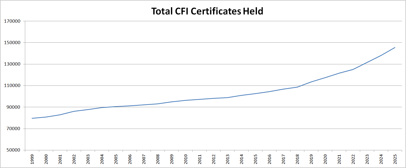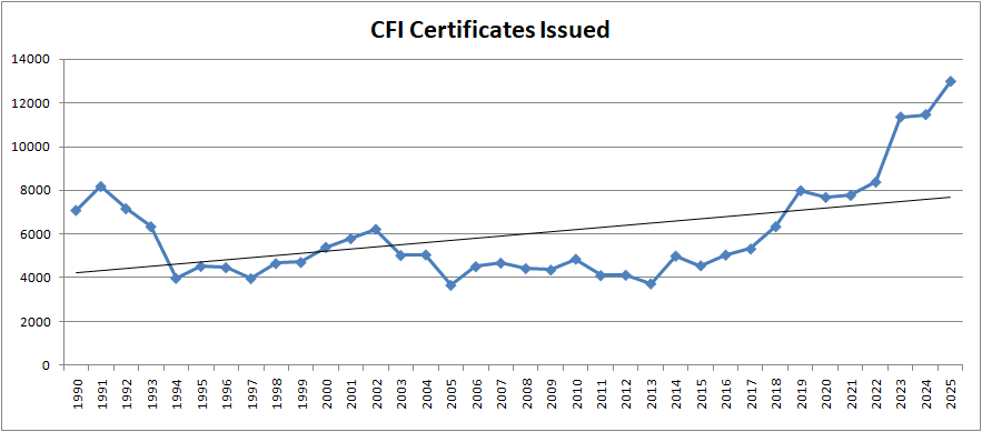 Last year again saw an increase in the number of CFI certificates issued. As a continuing primary pathway to gain experience as a pilot to become an ATP, we continue to see large numbers of CFI certificates issued. We can see from the following chart that the CFI certificated again went up in 2025.