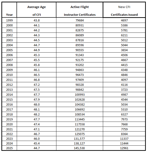 The table to the right here shows a few interesting data points: the number of active CFI certificates, how many new CFI certificates were issued in each year, and the average age of CFIs who held certificates in each year.