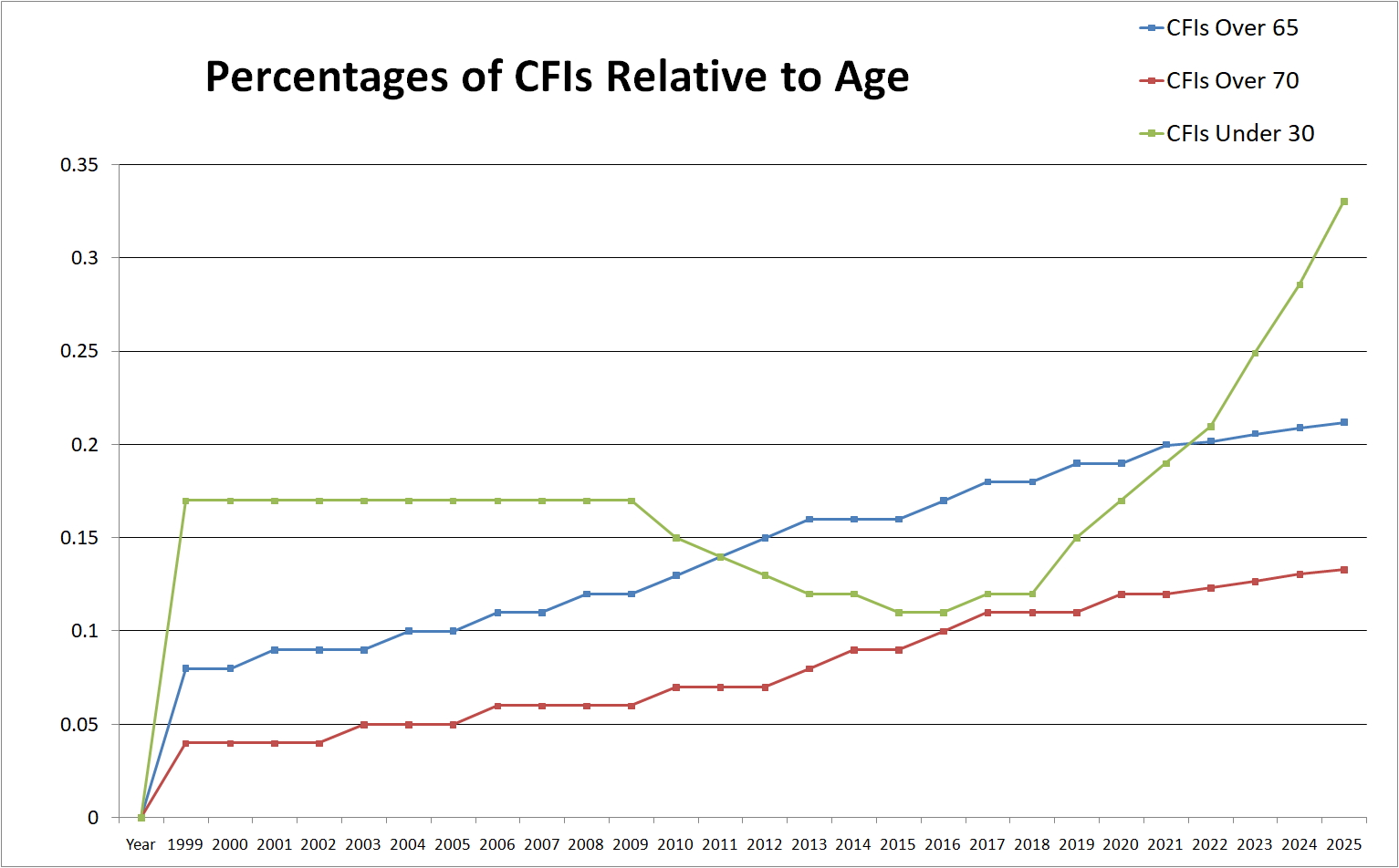 But there still exists a large data set of older CFIs in the total number. We can see from the chart below that there are larger percentages of our CFI population that are over the ages of 65 or even 70.