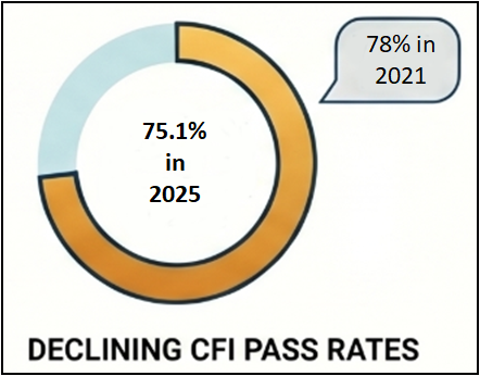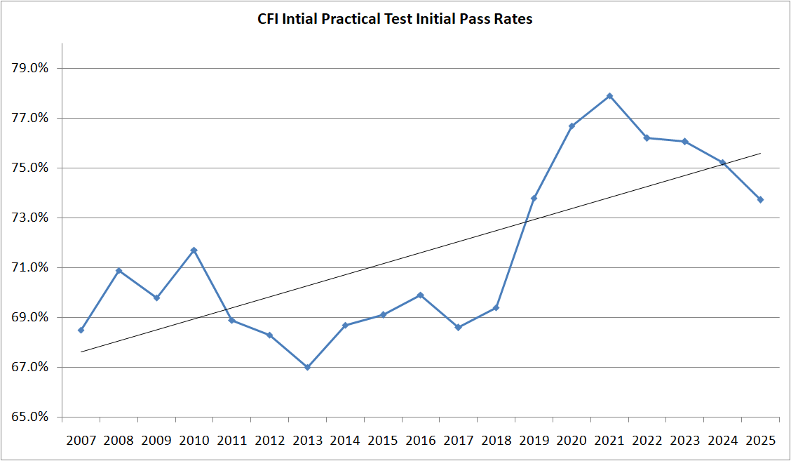 More information in an upcoming post will be presented on overall pass rates on certification events, but 2025 again saw the pass rate for initial CFI practical tests decrease. This trend has been going on since 2021 when it was at its peak at over 77%, with 2025 now dropping down to 73.7 percent. You can see the trend in the chart below. Check back in the upcoming days for more content on this and other certification points relative to pass rates in 2025 compared to recent years and the trends we are seeing.