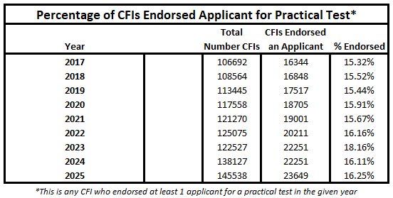We can see from the chart to the right here that it is a much smaller percentage of the CFI population that has signed off even 1 applicant for a practical test in any given year.