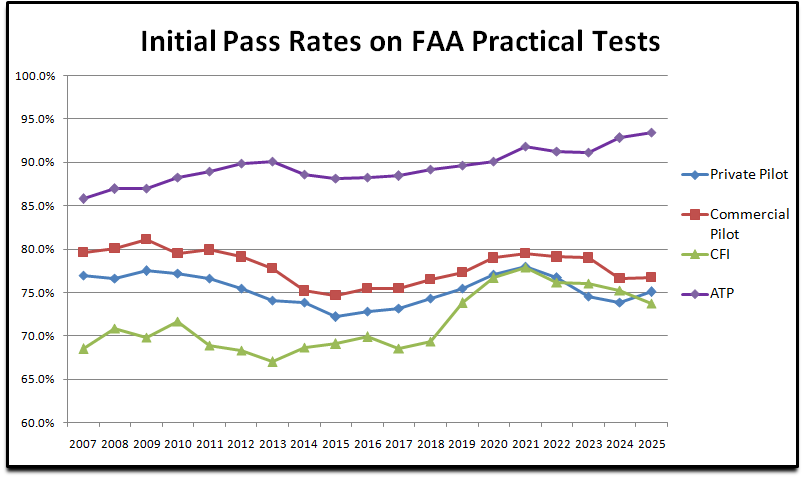 We saw positive trends on the Private Pilot, Commercial Pilot, and ATP practical test events. Not signficant changes in the pass rates, but at least not going down. The CFI was the one that continued to show a trend downward, though.
