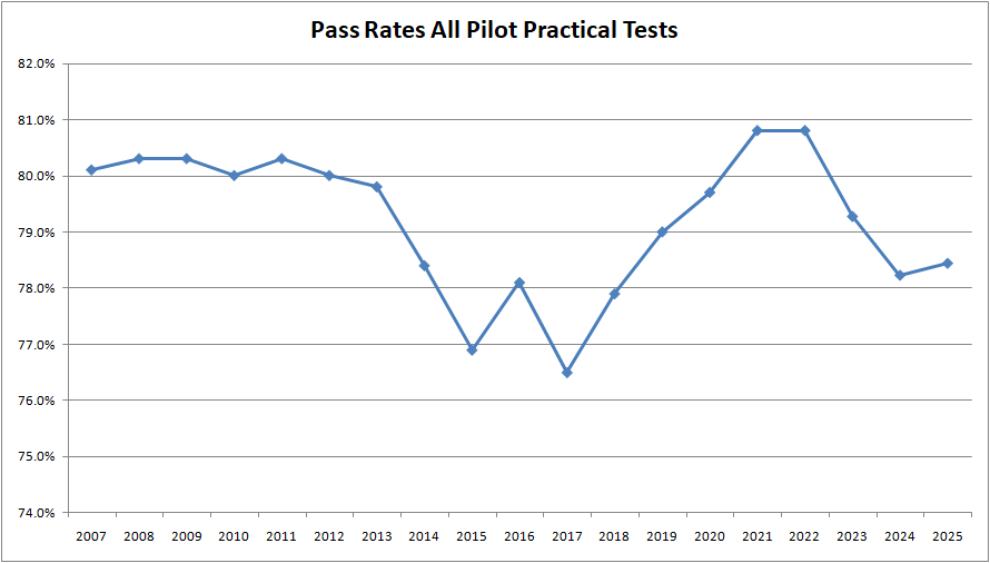 When it comes to sheer numbers, what this means is that, in one context, it means that if we consider that DPEs conducted 14,077 practical tests for CFI applicants (passes and failures included), that drop in pass rate from 75.2% to 73.7% means that DPEs had to do an additional 280 retest practical tests. That is the equivalent of a fully active high-activity DPE. The point I am making here is that pass rates affect lots of things, including DPE availability.