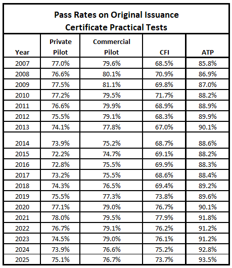 But that’s a lot of different kinds of tests. When it comes to the pilot pipeline, I like to break it down more in terms of some of the common testing events. We can see the pass rates on the Private Pilot, the Commercial Pilot, the CFI, and the ATP practical tests.